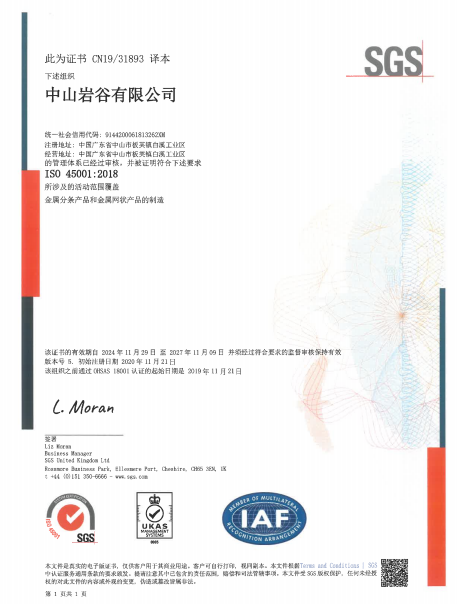 中山岩谷有限公司(ZIC)は、ISO9001、ISO14001、ISO45001、IATF16949認証を取得しています。